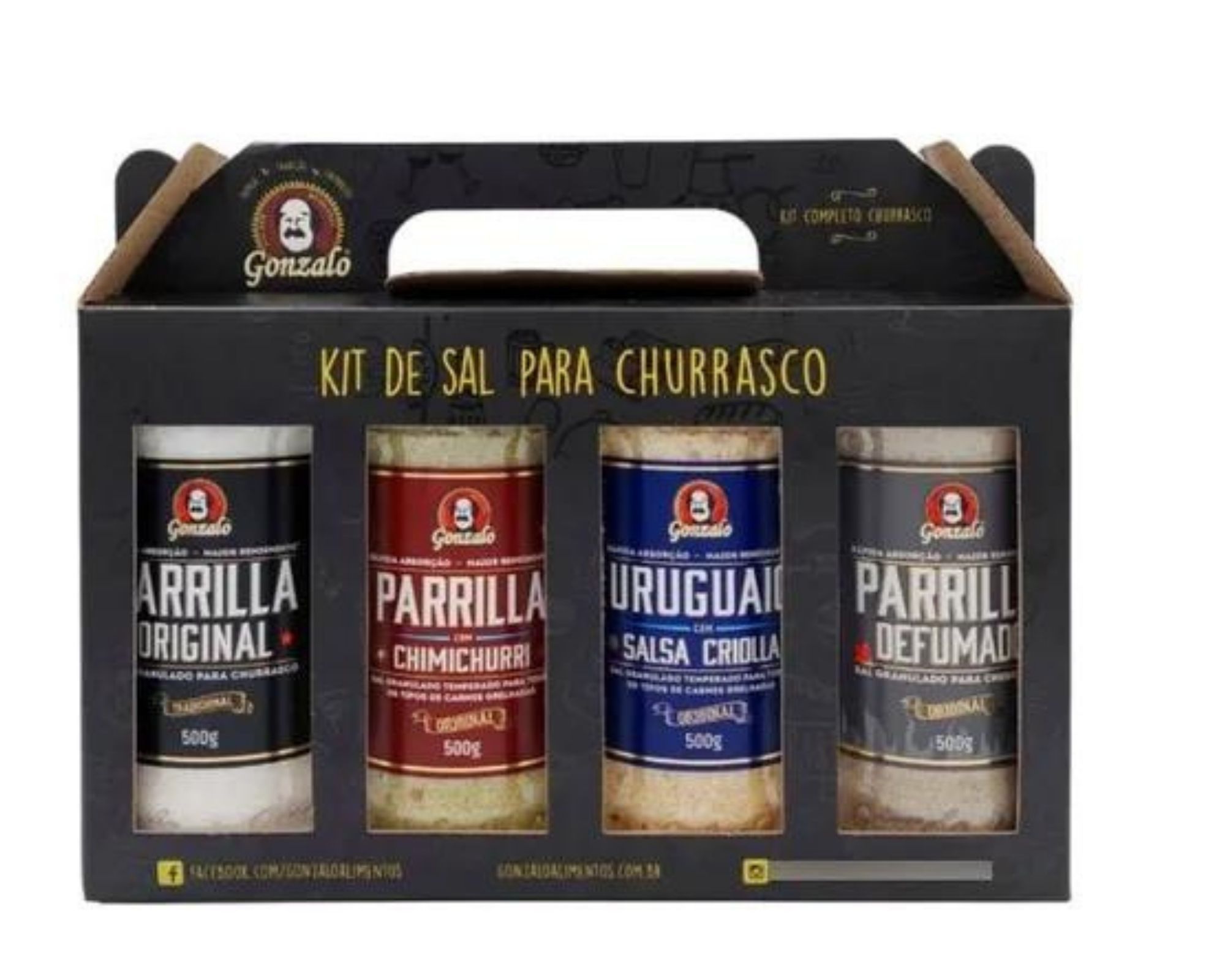 Este kit é composto por: 1:. Sal Granulado Parrilla Original 500g, 2:. Sal Granulado com Chimichurri - Composição: Cebola, Alho, Salsinha, Cebolinha Verde, Orégano e Pimenta 500g, 3:. Sal Granulado (Uruguaio) com Salsa Criolla - Composição: Cebola, Alho, Tomate, Pimentão e Especiarias 500g, 4:. Sal Granulado Parrilla Defumado- composição: sal marinho iodado defumado.